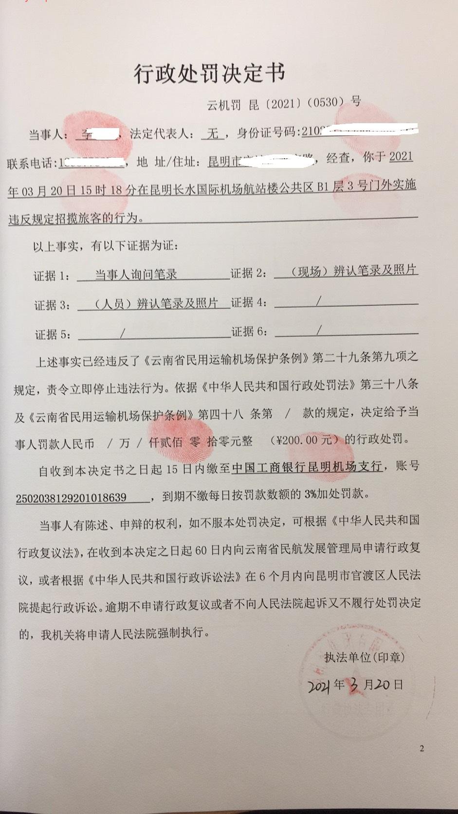 行政处罚决定书 云机罚 昆{2021} (0531)号