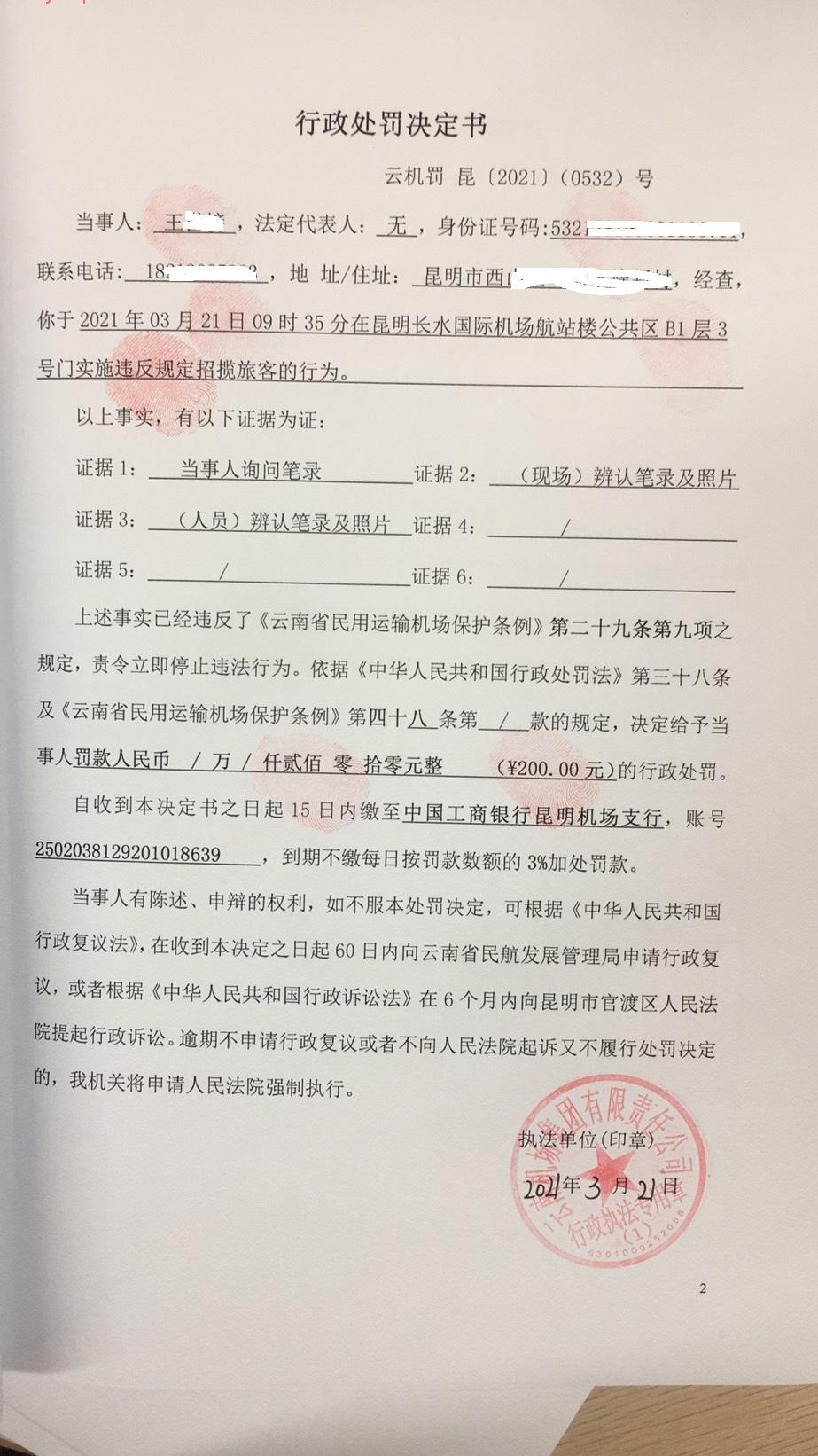 行政处罚决定书 云机罚 昆{2021} (0532)号