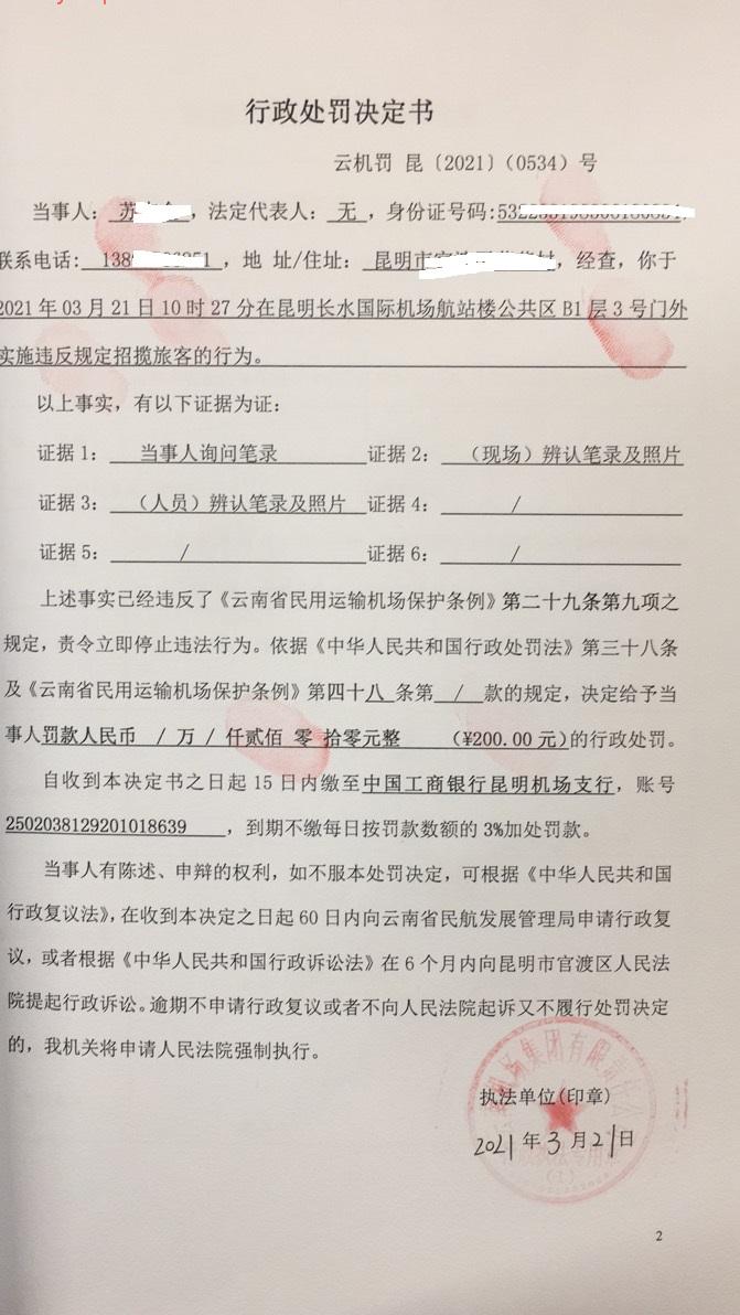 行政处罚决定书 云机罚 昆{2021} (0534)号