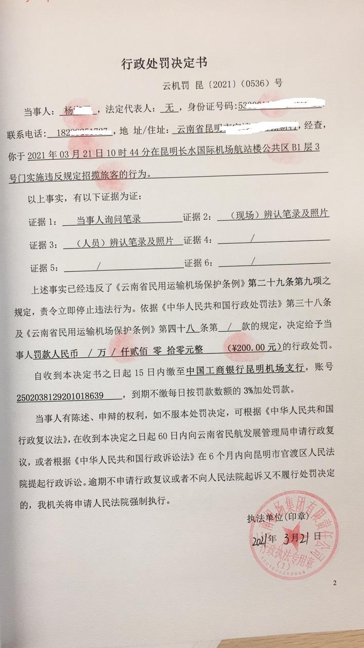 行政处罚决定书 云机罚 昆{2021} (0537)号