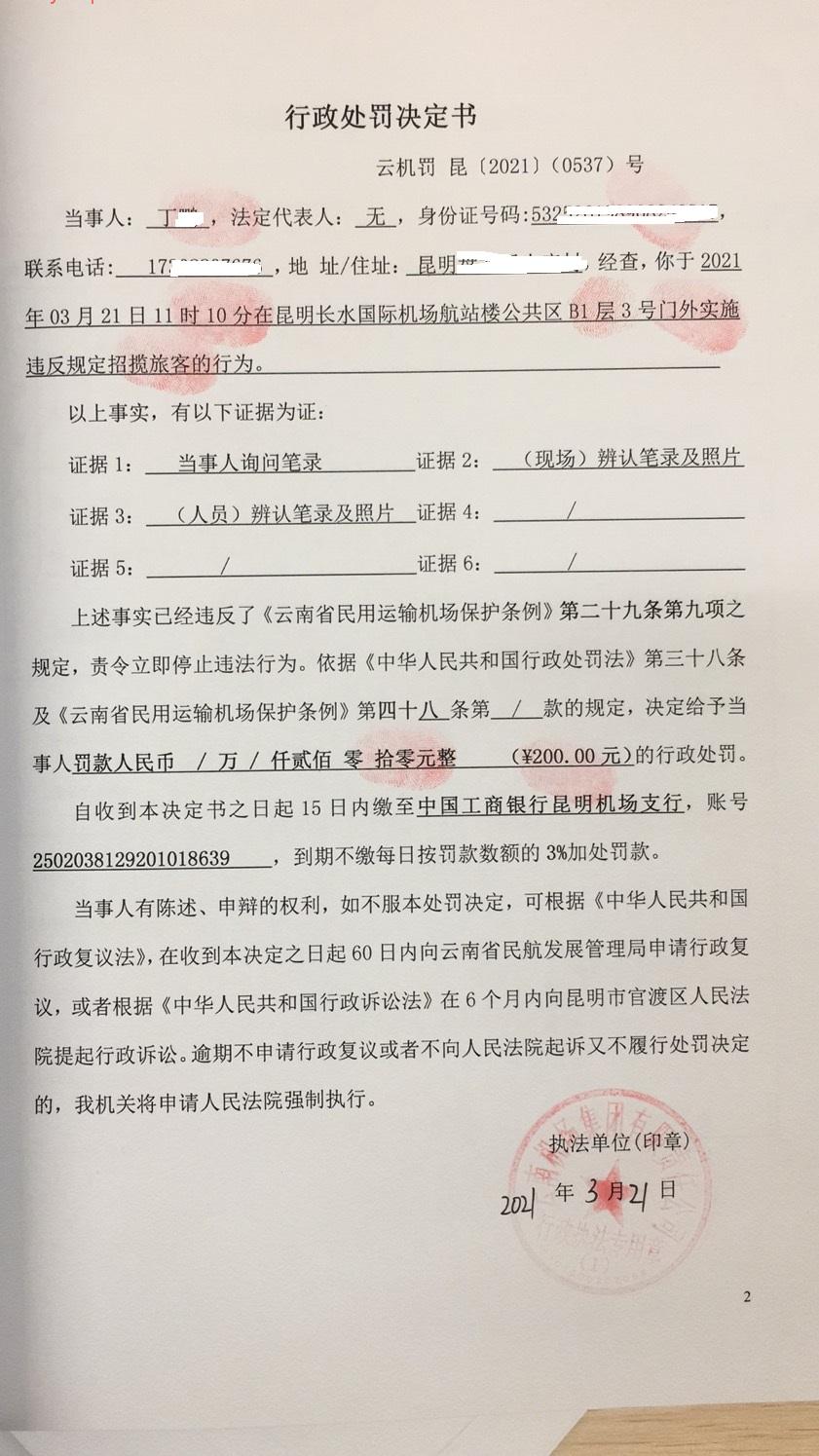 行政处罚决定书 云机罚 昆{2021} (0537)号