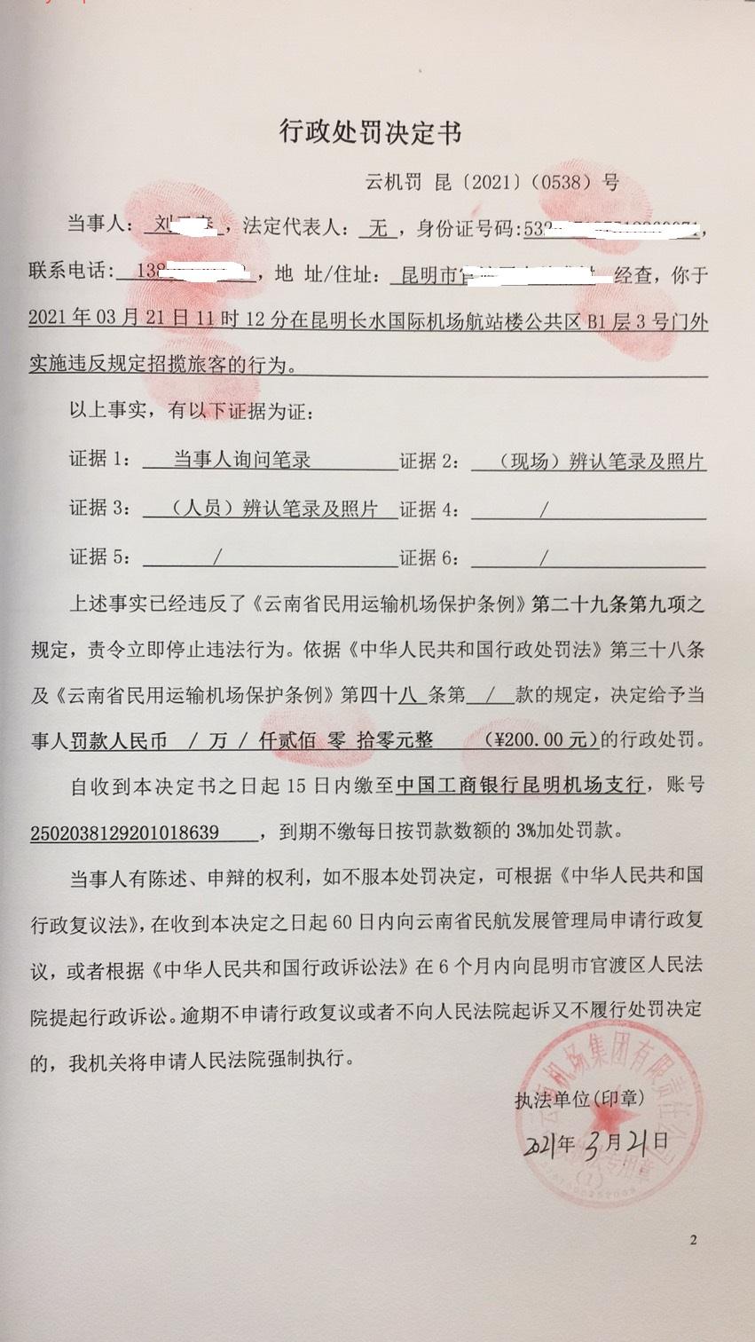行政处罚决定书 云机罚 昆{2021} (0538)号