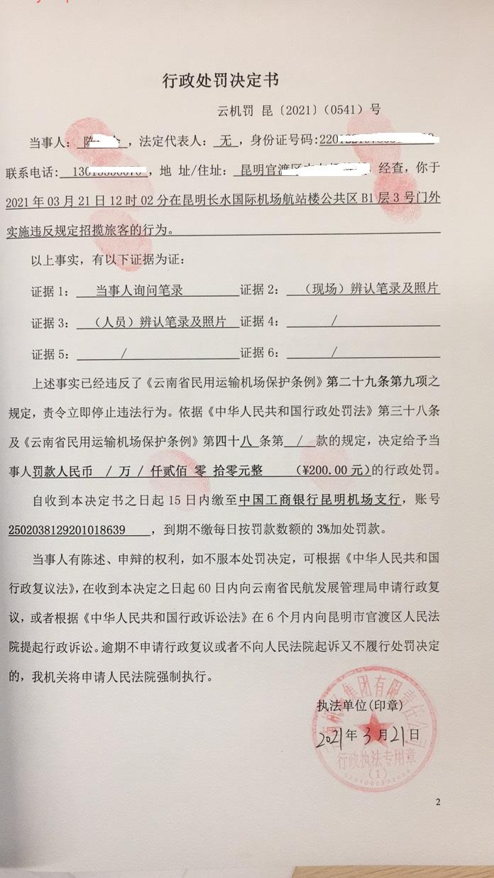 行政处罚决定书 云机罚 昆{2021} (0541)号