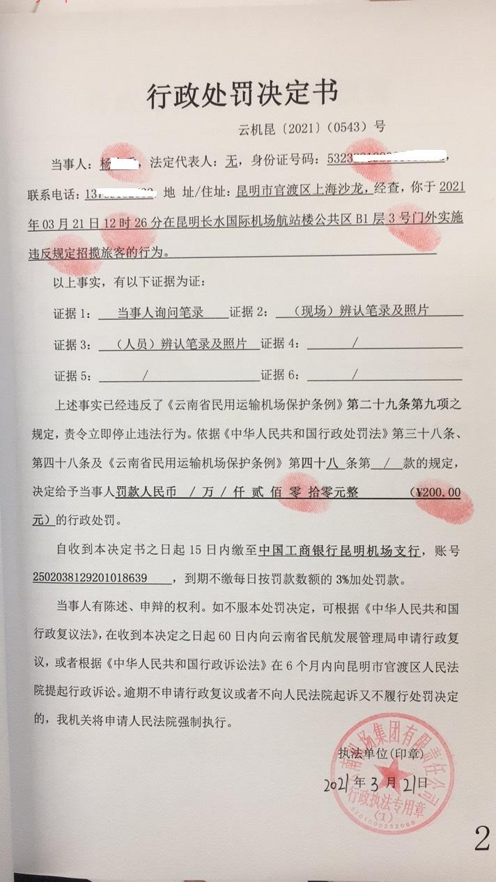 行政处罚决定书 云机罚 昆{2021} (0543)号