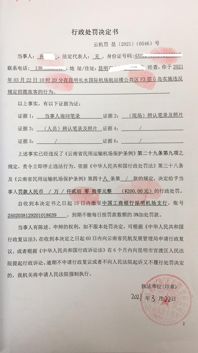 行政处罚决定书 云机罚 昆{2021} (0546)号