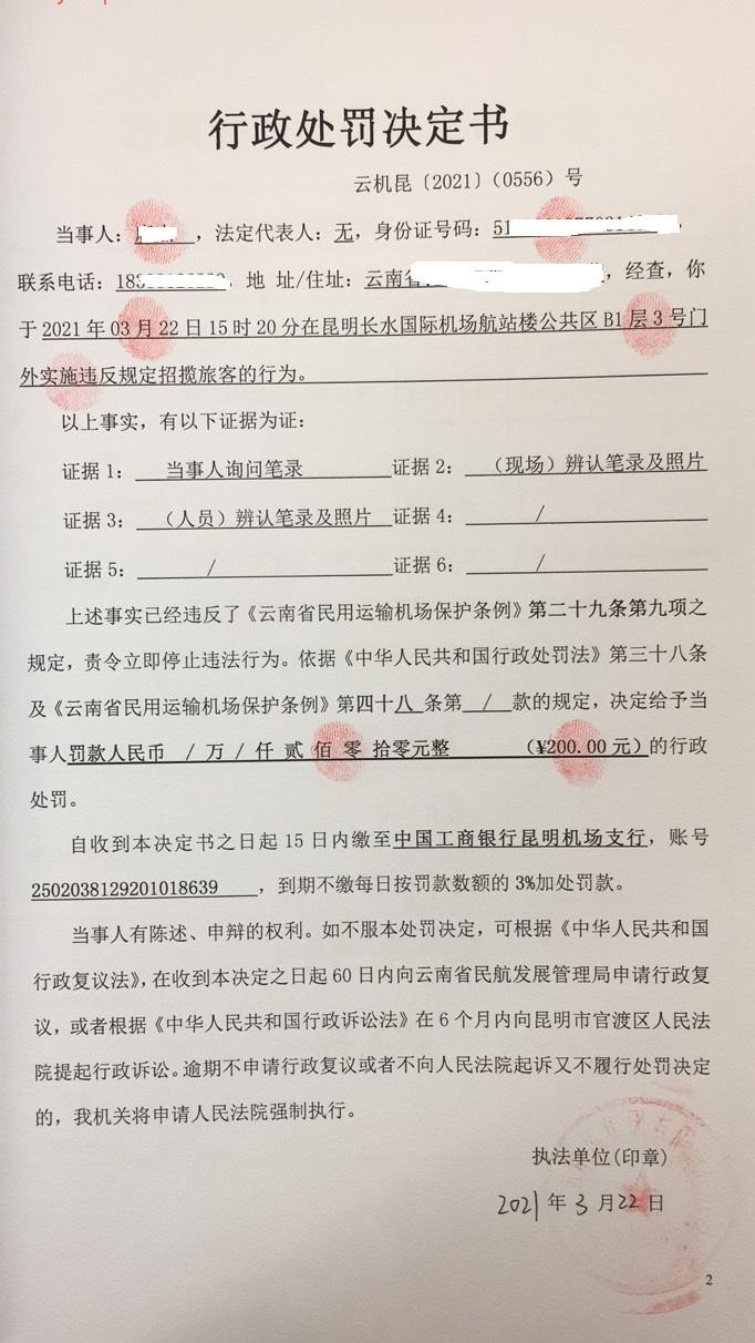 行政处罚决定书 云机罚 昆{2021} (0555)号