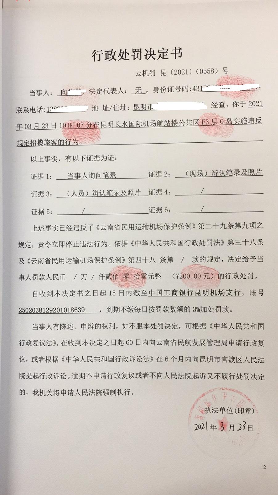行政处罚决定书 云机罚 昆{2021} (0558)号
