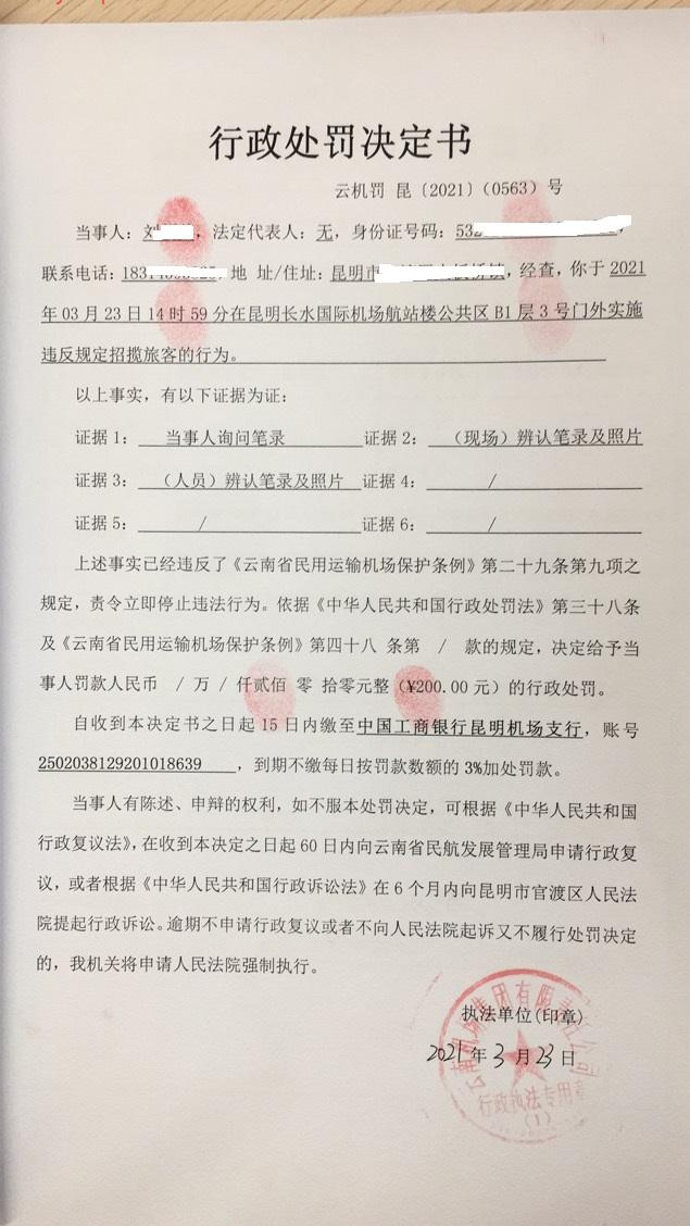 行政处罚决定书 云机罚 昆{2021} (0563)号