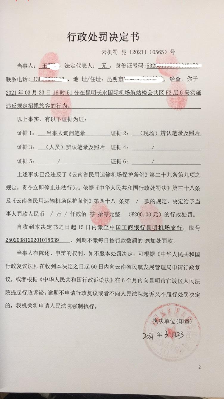 行政处罚决定书 云机罚 昆{2021} (0565)号