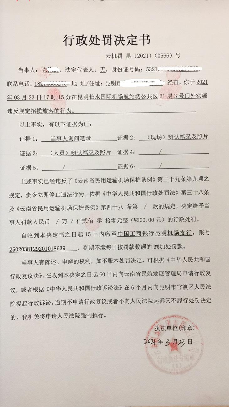 行政处罚决定书 云机罚 昆{2021} (0566)号