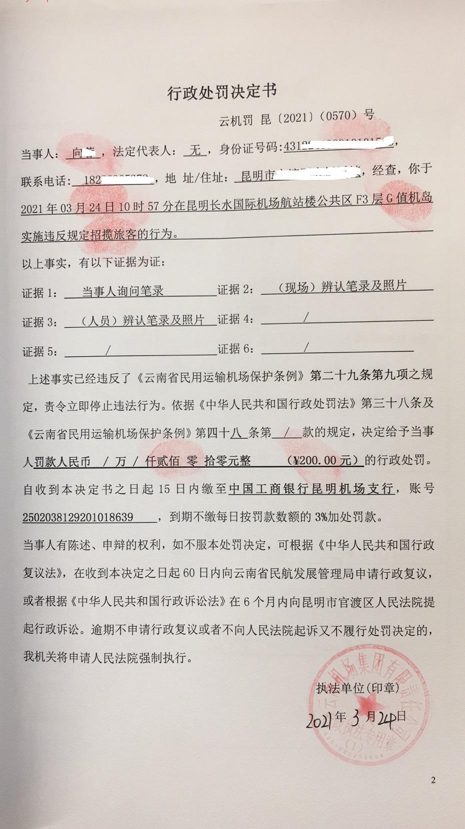 行政处罚决定书 云机罚 昆{2021} (0570)号