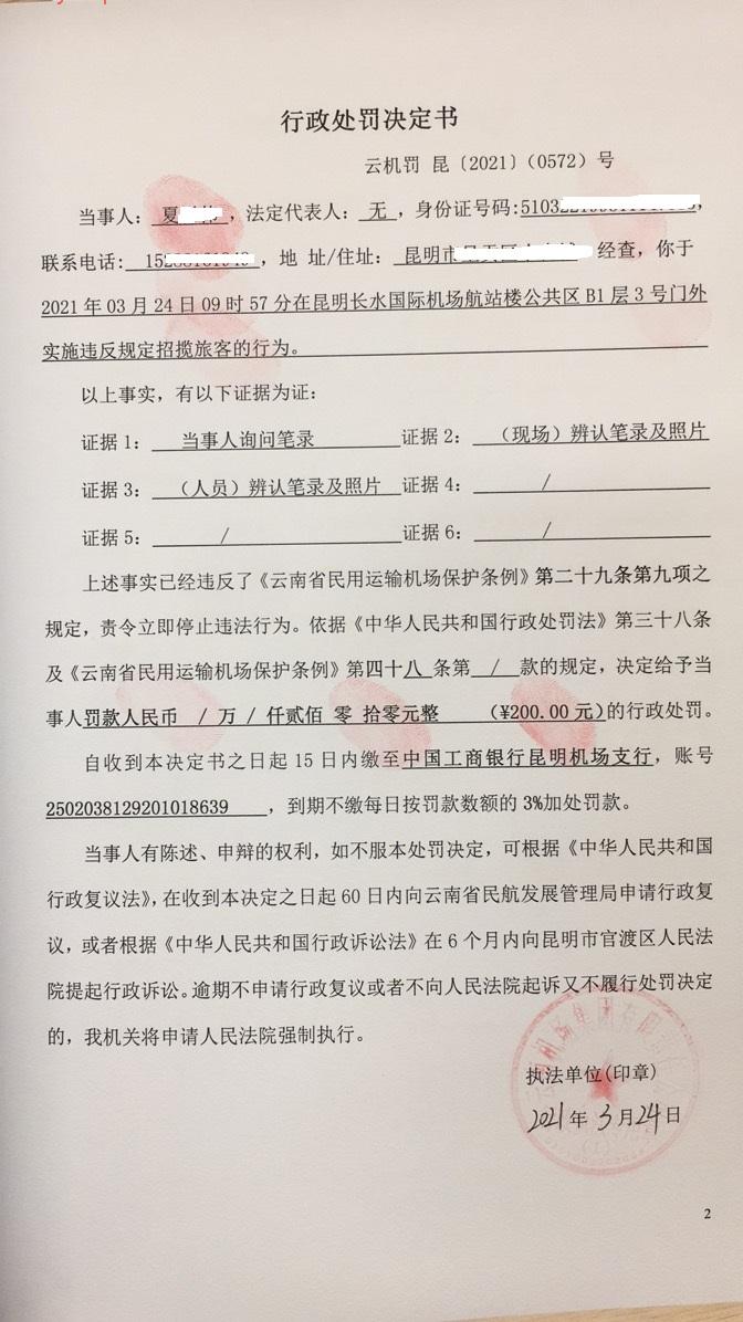行政处罚决定书 云机罚 昆{2021} (0572)号