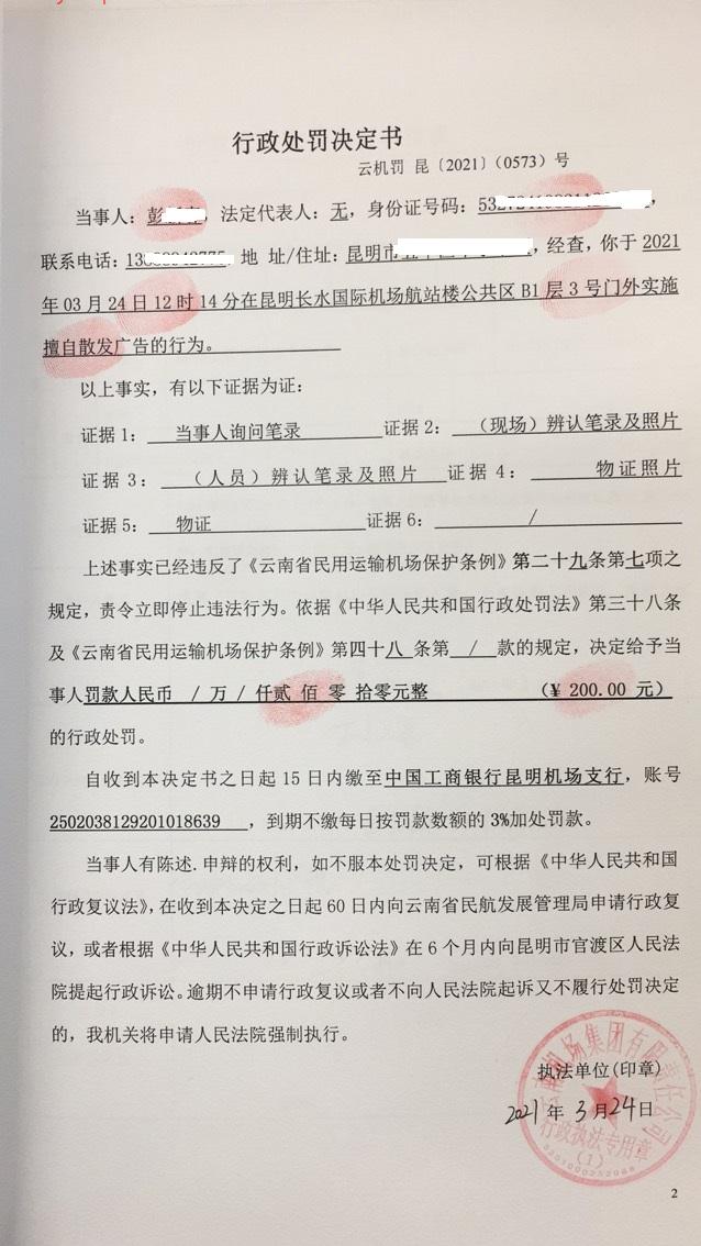 行政处罚决定书 云机罚 昆{2021} (0573)号