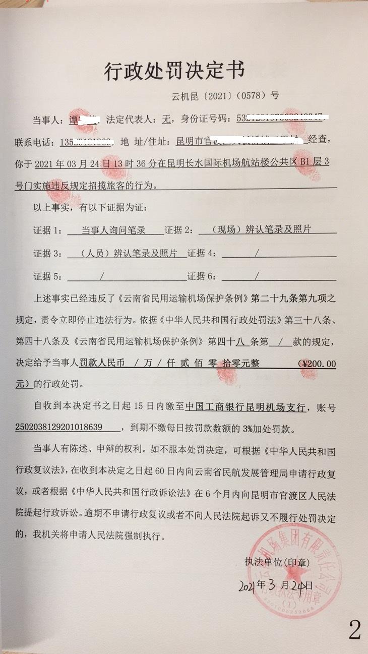 行政处罚决定书 云机罚 昆{2021} (0578)号