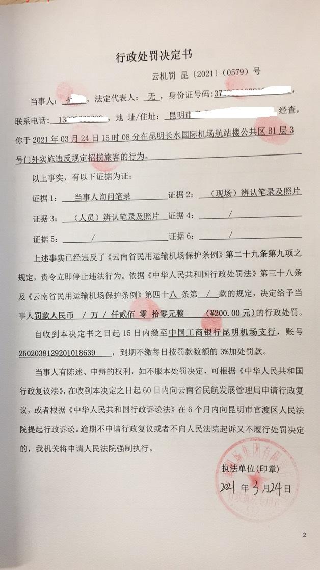 行政处罚决定书 云机罚 昆{2021} (0579)号