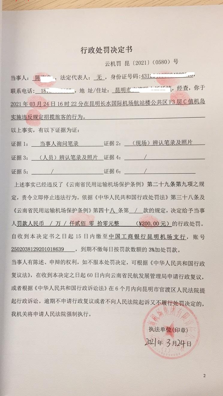 行政处罚决定书 云机罚 昆{2021} (0579)号