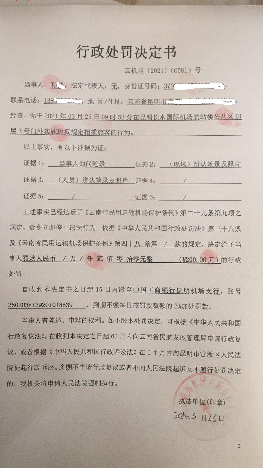 行政处罚决定书 云机罚 昆{2021} (0581)号