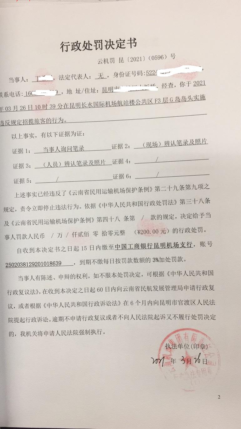 行政处罚决定书 云机罚 昆{2021} (0596)号