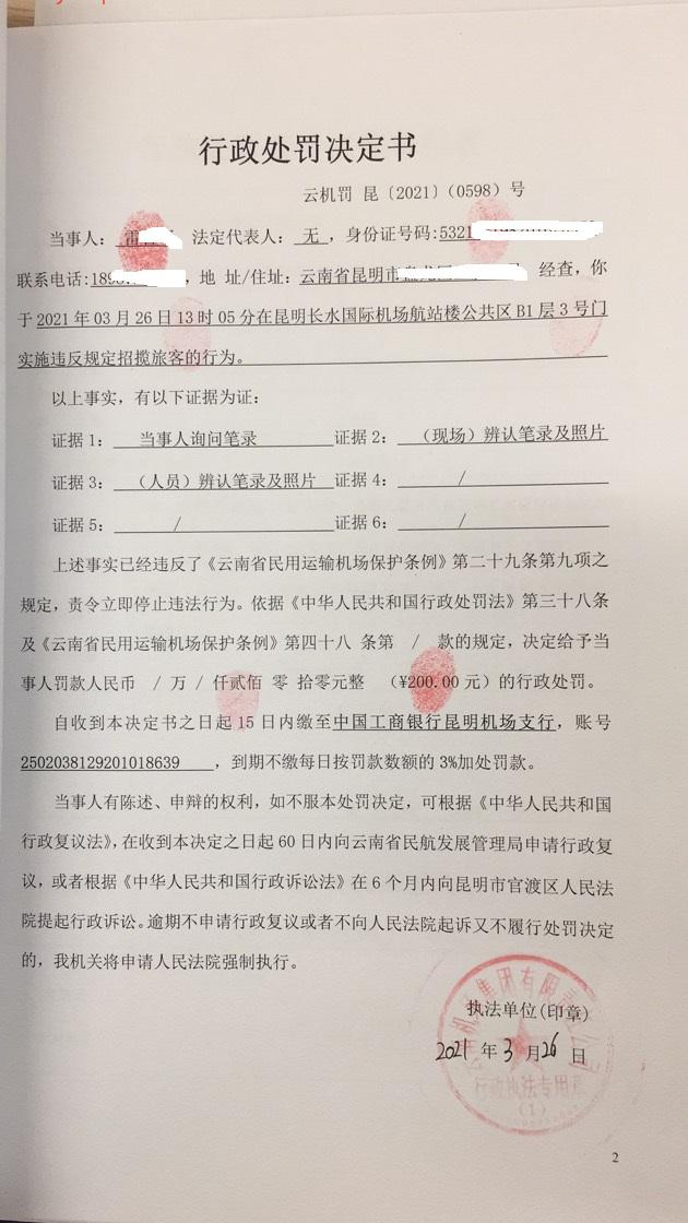 行政处罚决定书 云机罚 昆{2021} (0598)号