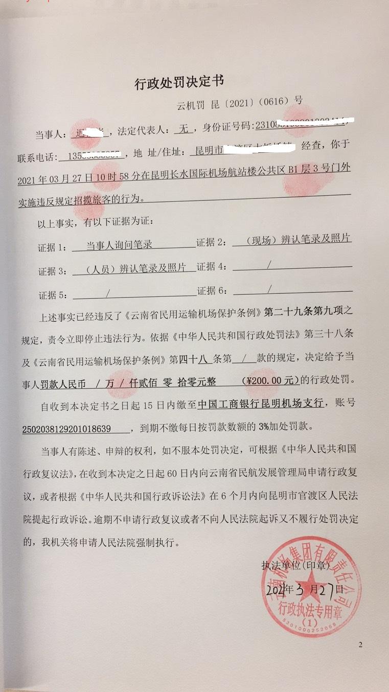 行政处罚决定书 云机罚 昆{2021} (0616)号