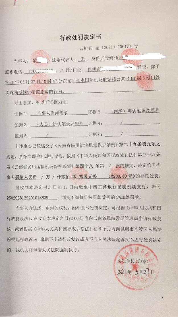 行政处罚决定书 云机罚 昆{2021} (0617)号
