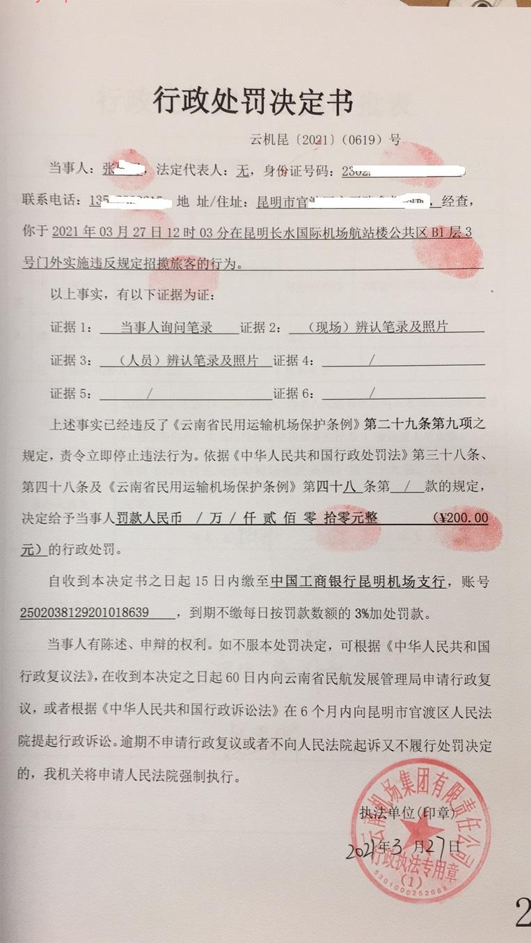 行政处罚决定书 云机罚 昆{2021} (0618)号