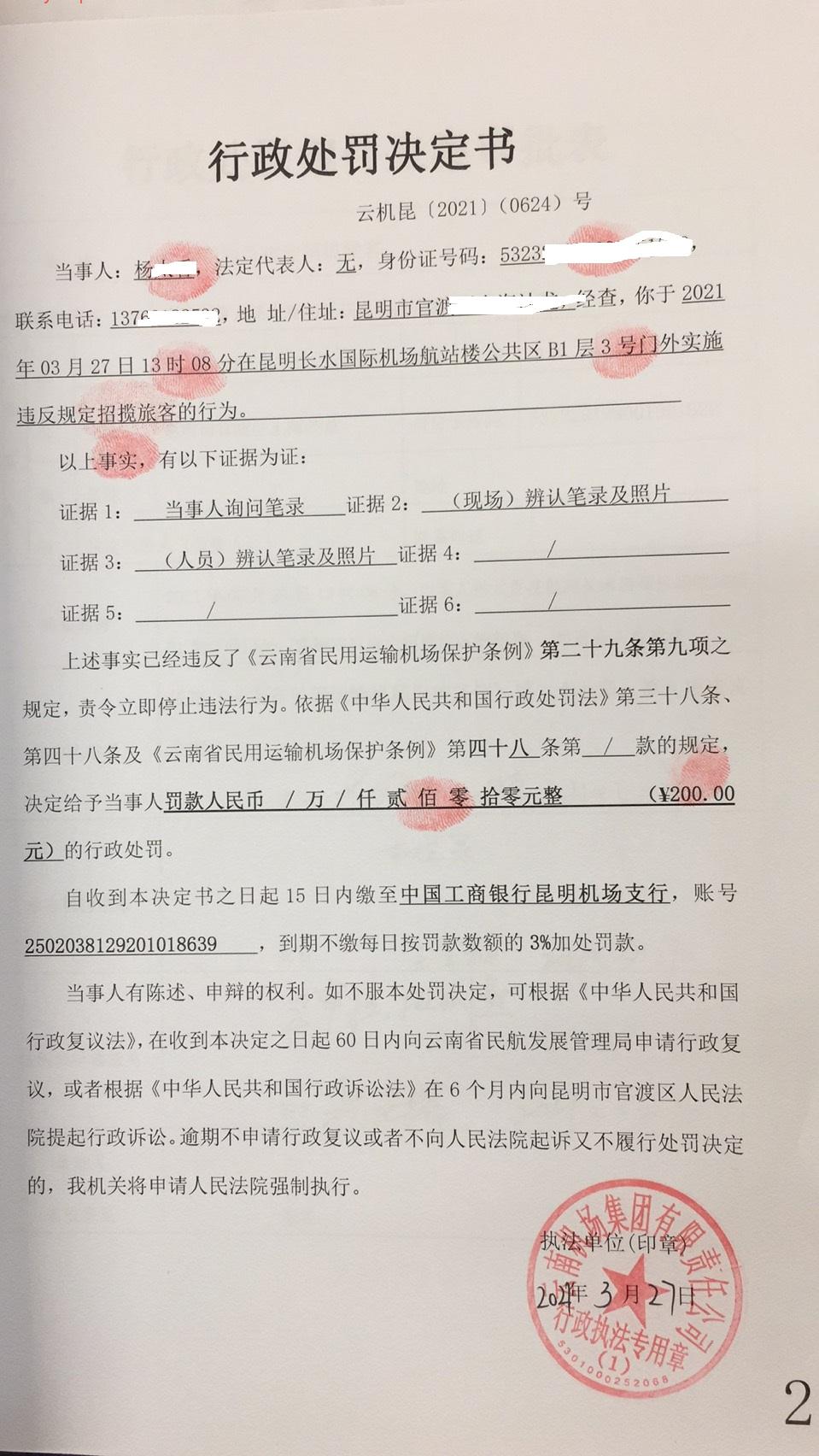 行政处罚决定书 云机罚 昆{2021} (0624)号