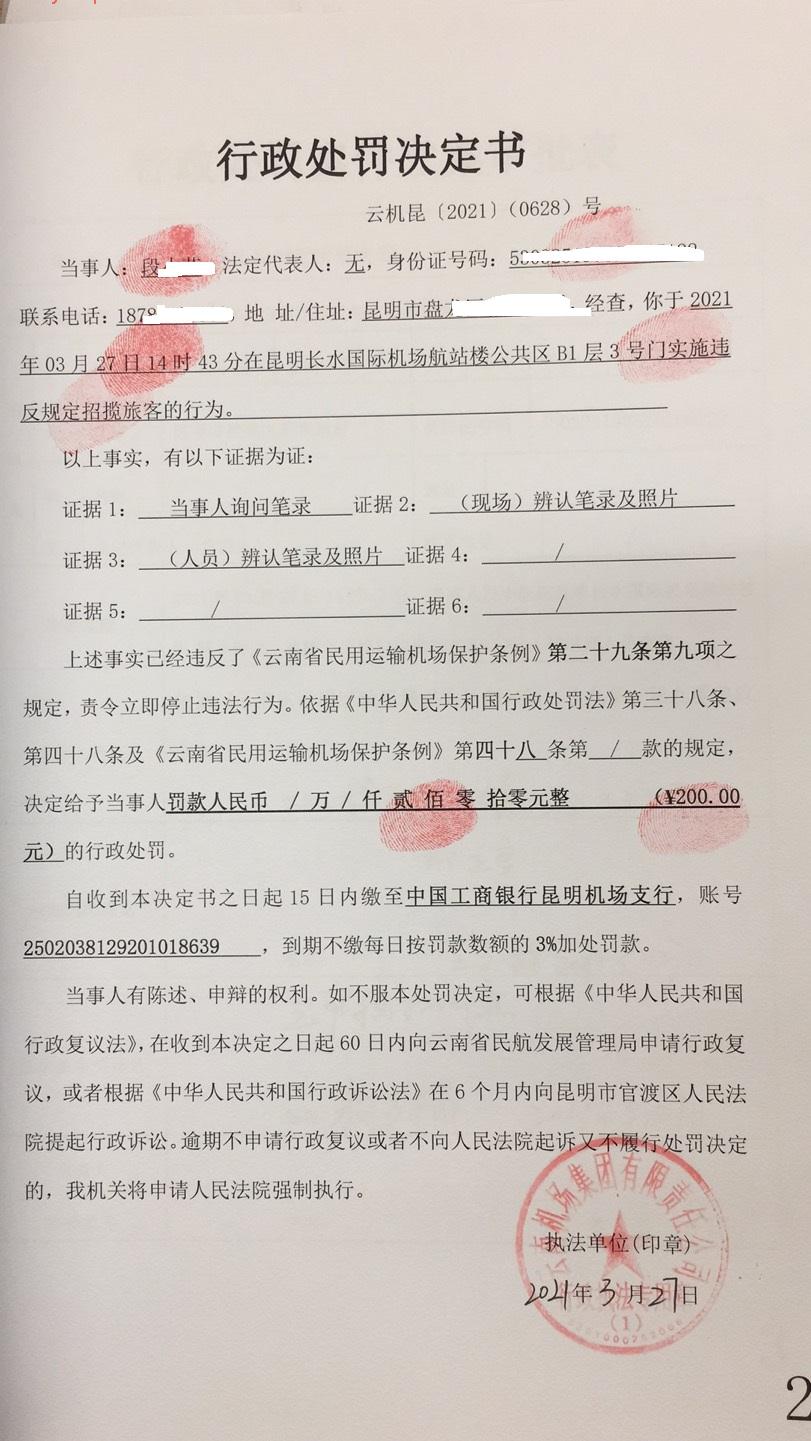 行政处罚决定书 云机罚 昆{2021} (0629)号