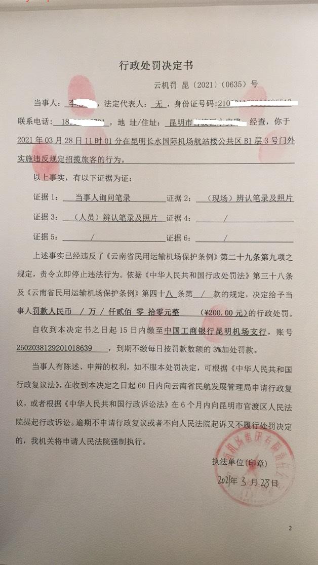 行政处罚决定书 云机罚 昆{2021} (0634)号