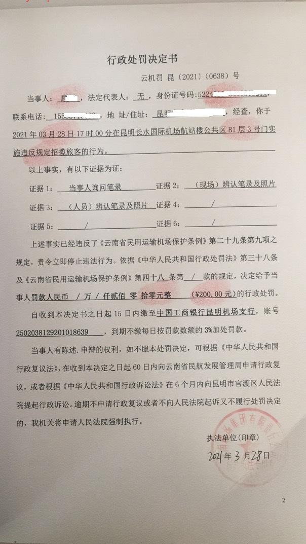 行政处罚决定书 云机罚 昆{2021} (0638)号