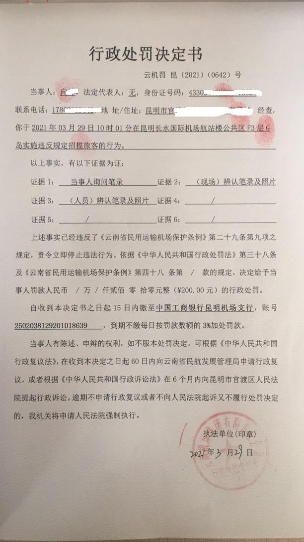 行政处罚决定书 云机罚 昆{2021} (0642)号
