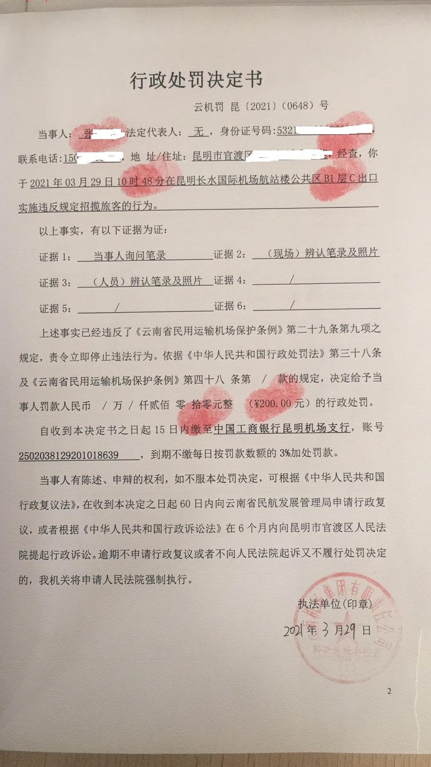 行政处罚决定书 云机罚 昆{2021} (0648)号