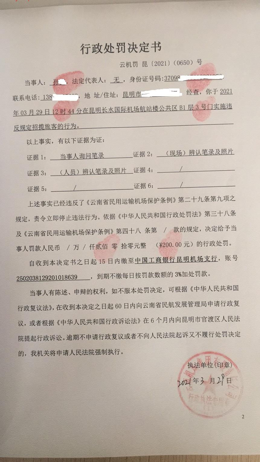 行政处罚决定书 云机罚 昆{2021} (0649)号