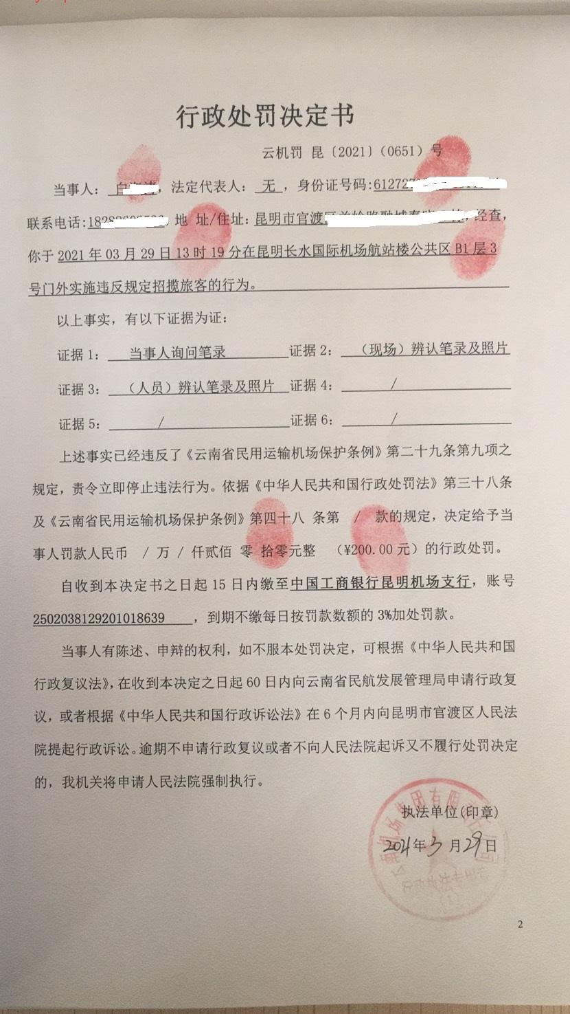 行政处罚决定书 云机罚 昆{2021} (0652)号