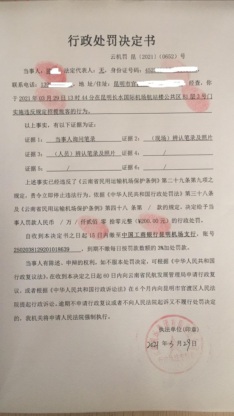 行政处罚决定书 云机罚 昆{2021} (0653)号
