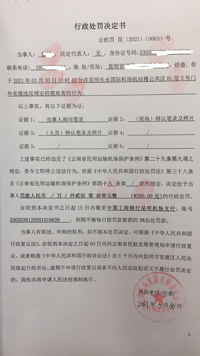 行政处罚决定书 云机罚 昆{2021} (0663)号