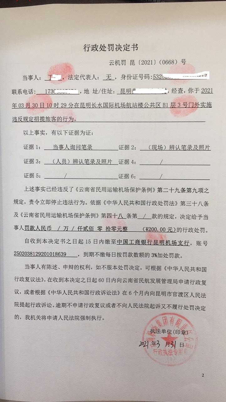 行政处罚决定书 云机罚 昆{2021} (0668)号