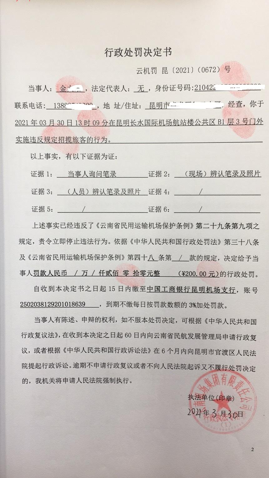 行政处罚决定书 云机罚 昆{2021} (0672)号