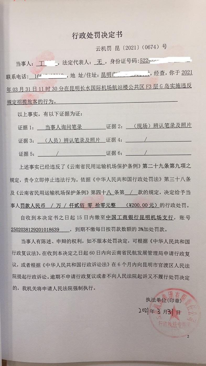 行政处罚决定书 云机罚 昆{2021} (0674)号
