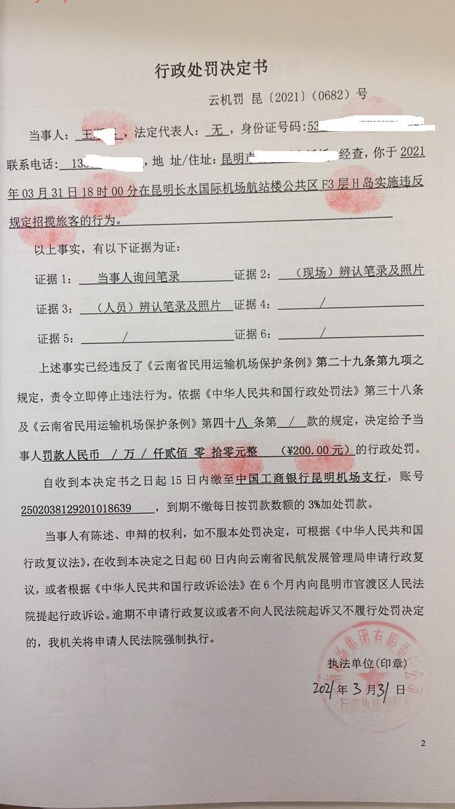 行政处罚决定书 云机罚 昆{2021} (0683)号