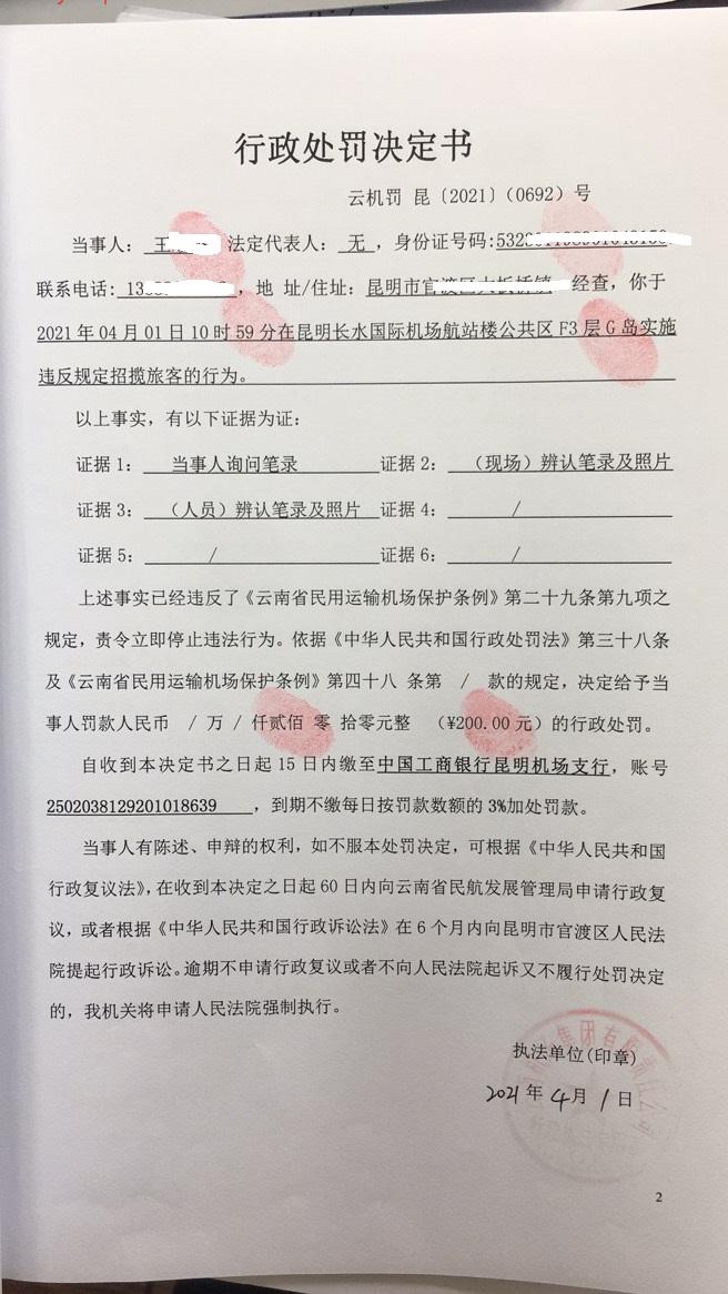 行政处罚决定书 云机罚 昆{2021} (0692)号