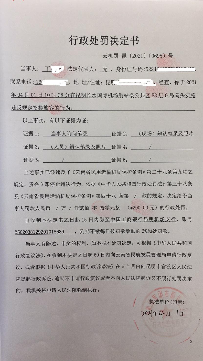 行政处罚决定书 云机罚 昆{2021} (0696)号