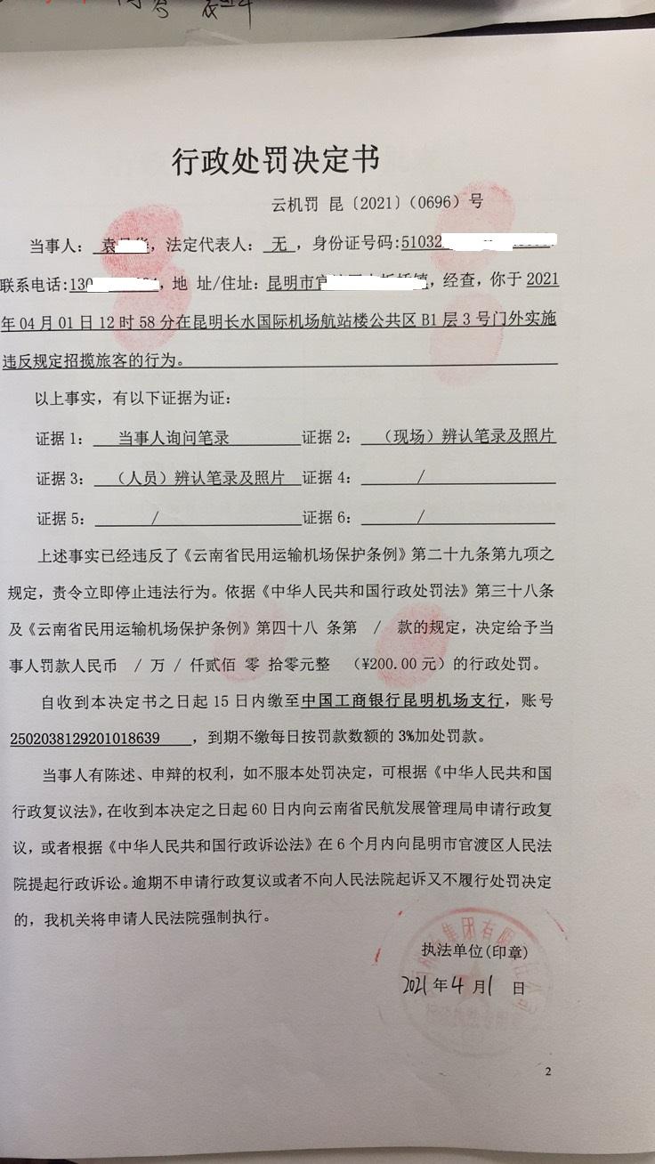 行政处罚决定书 云机罚 昆{2021} (0696)号
