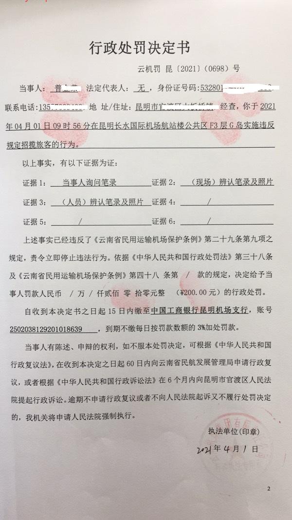 行政处罚决定书 云机罚 昆{2021} (0698)号