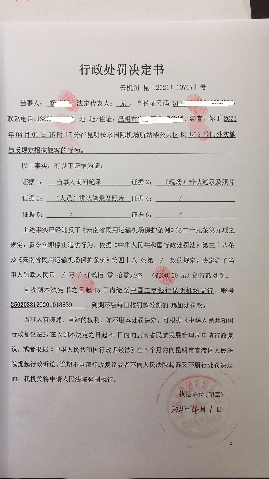 行政处罚决定书 云机罚 昆{2021} (0707)号