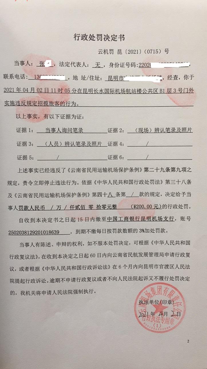 行政处罚决定书 云机罚 昆{2021} (0716)号