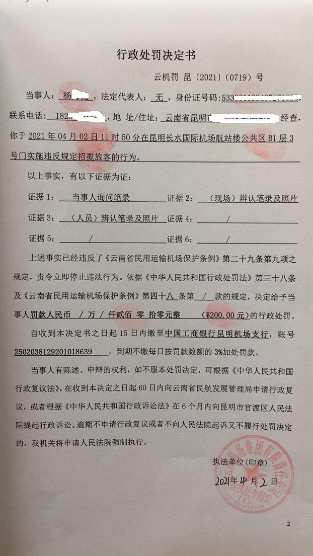 行政处罚决定书 云机罚 昆{2021} (0719)号