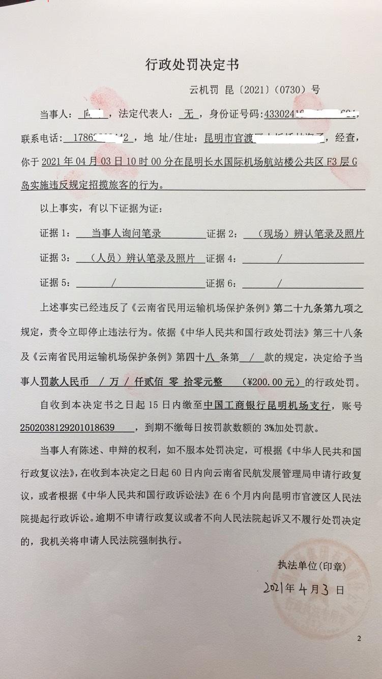 行政处罚决定书 云机罚 昆{2021} (0730)号