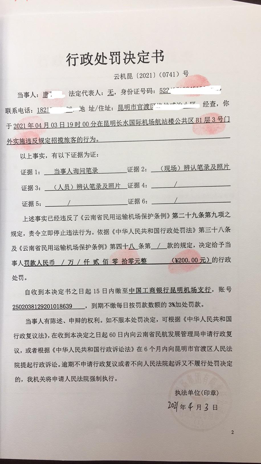 行政处罚决定书 云机罚 昆{2021} (0741)号
