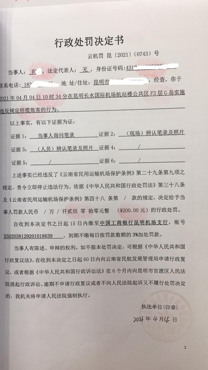 行政处罚决定书 云机罚 昆{2021} (0743)号